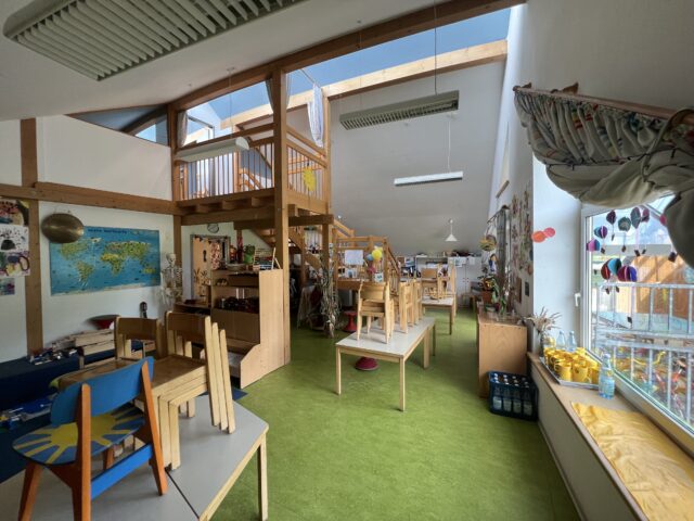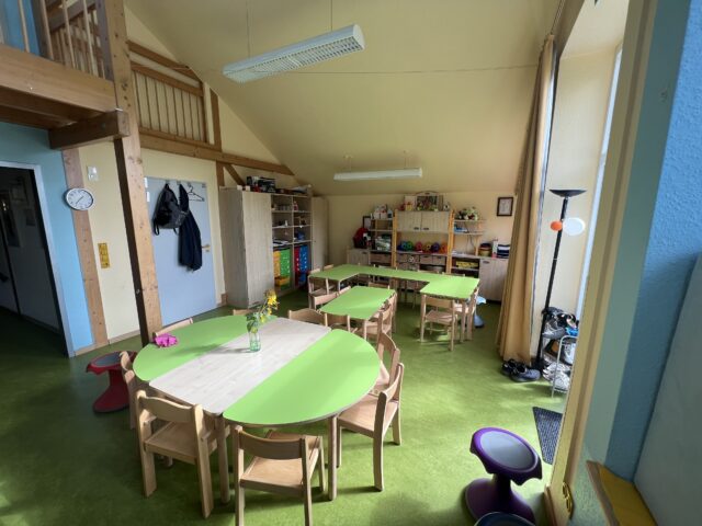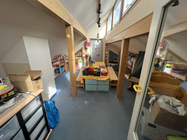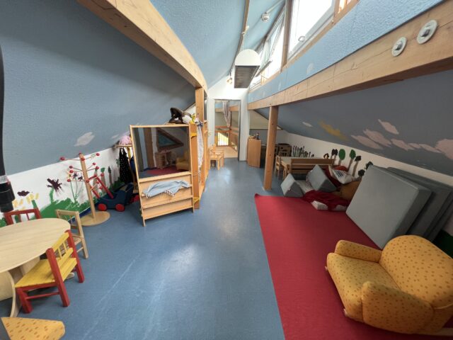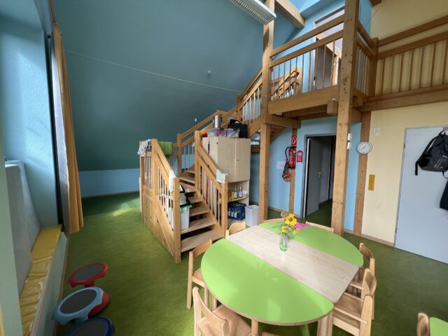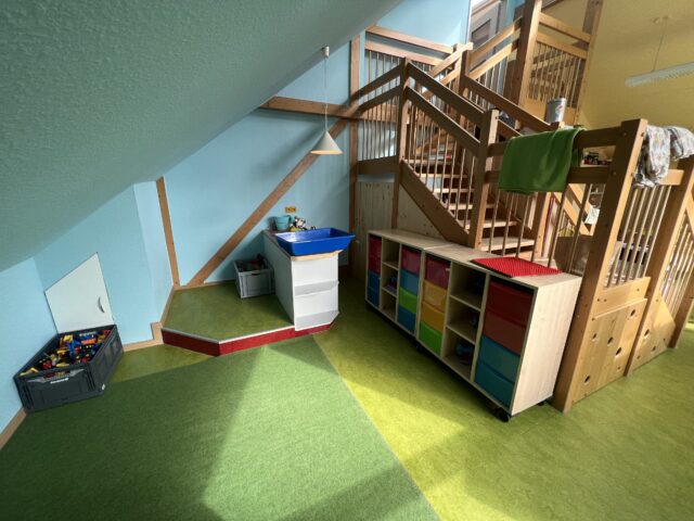 Der Gruppenraum lädt mit einer großen Bauecke und einer beliebten „Höhle“ unter der Treppe zum Gestalten und Spielen ein. Über die Treppe erreichen die Kinder den Werkraum, in dem handwerklich und kreativ gearbeitet wird.