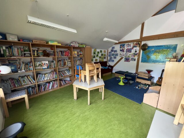 Der Gruppenraum verfügt über eine gemütliche Bücherei und eine Küchenzeile für gemeinsame Backaktionen. In der zweiten Ebene lädt ein Rollenspielbereich mit Kostümen zum fantasievollen Spiel ein.